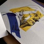 With its bold yellow and blue color blocks, this piece fuses expressive realism with modern abstraction. The carefully rendered ink lines convey detail and depth, while the simplified planes of color highlight form, direction, and presence.