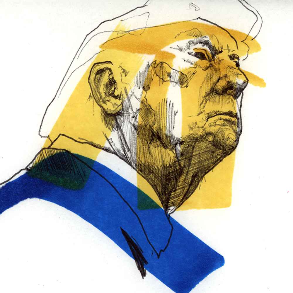 With its angular composition, layered yellow highlights, and deep blue structural base, the piece conveys confidence, motion, and the weight of leadership. Every stroke is intentional — merging precision penwork with broad, architectural color planes that shape both space and emotion.