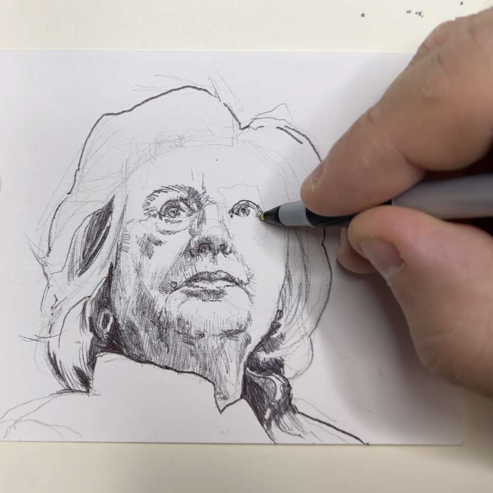This 4x6 original graphite drawing portrays Hillary Clinton in a striking upward gaze — an angle that conveys determination, resilience, and reflective strength. The pencil work is dense and deliberate, blending precision linework with expressive shadowing to create depth and presence.