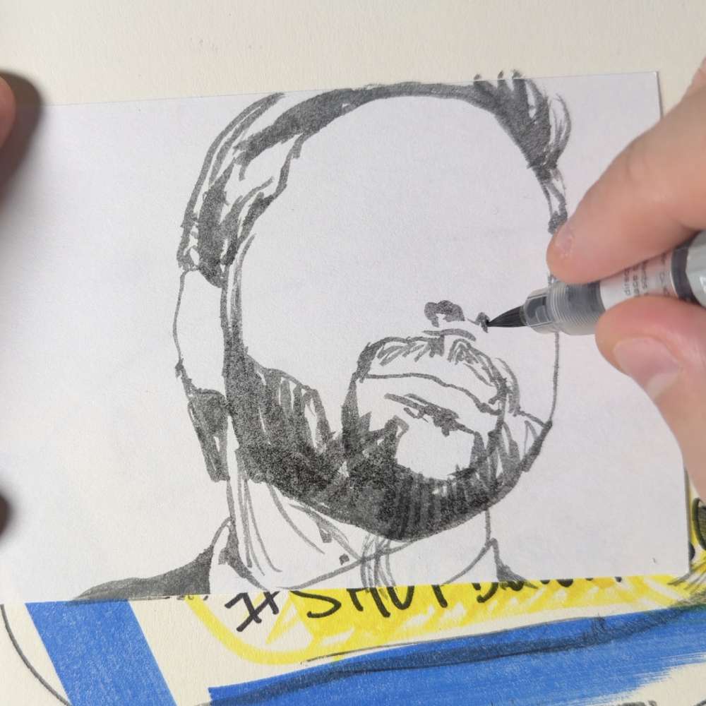 Each brush and pen stroke works to reveal the structure beneath expression — the balance of determination and restraint. The upward gaze and heavy ink shadows give the piece an almost cinematic quality, a study in posture, conviction, and character.