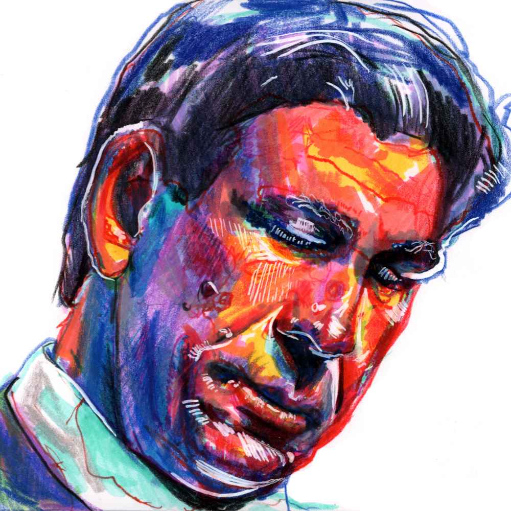 This 5x7 original mixed media portrait of Ron DeSantis blends color, emotion, and expressive realism. The contemplative pose, rendered in luminous hues, invites a more nuanced look at one of America’s most prominent political figures.