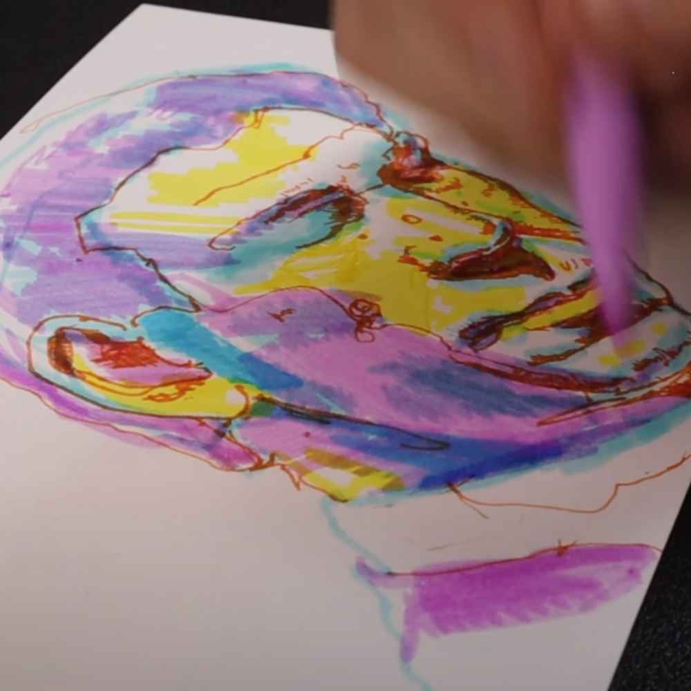 Created using a mix of markers, ink, and colored pencil, the artwork showcases a bold interplay of reds, blues, purples, and yellows — giving the piece both visual rhythm and psychological depth. The layered textures highlight personality and presence in equal measure.