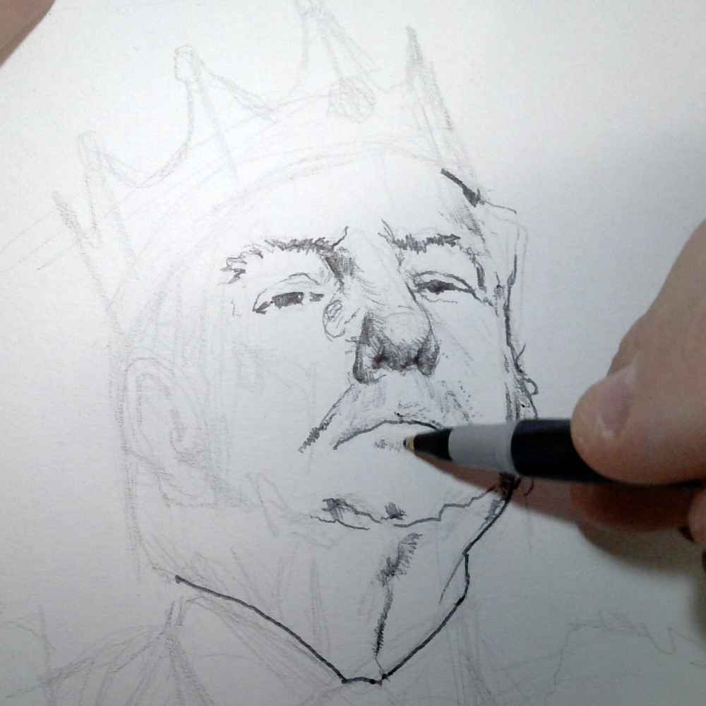 Rendered entirely in fine pen and ink, each stroke is deliberate — defining form, texture, and shadow with meticulous control. The balance of realism and symbolism gives this portrait a timeless, illustrative quality, inviting reflection on leadership and perception.
