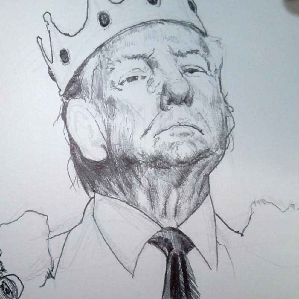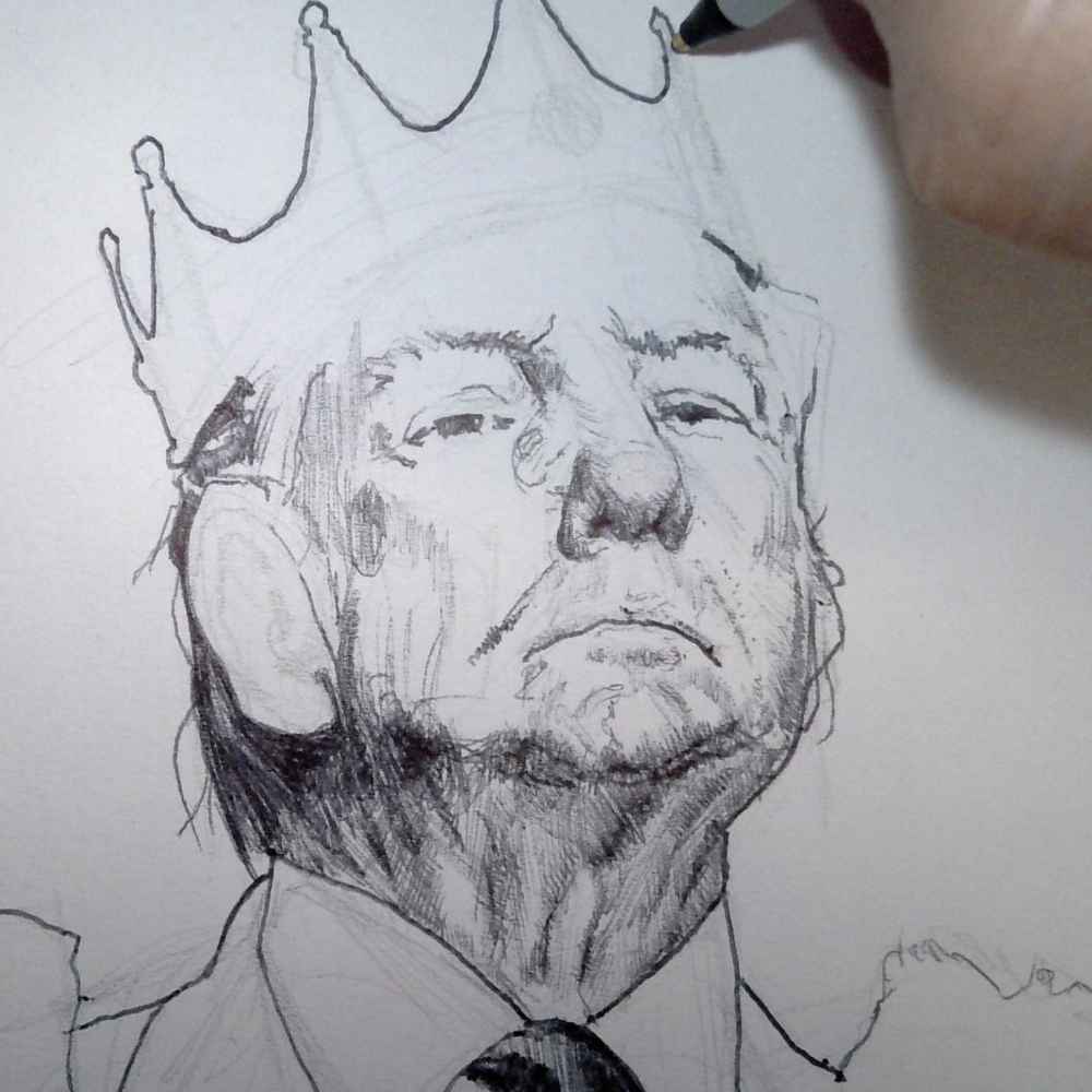 This 8x10 pen and ink portrait of Donald Trump, titled The Crown, explores themes of authority, confidence, and identity through bold linework and symbolic realism. The upward gaze and regal crown create a composition that blends portraiture with allegory.