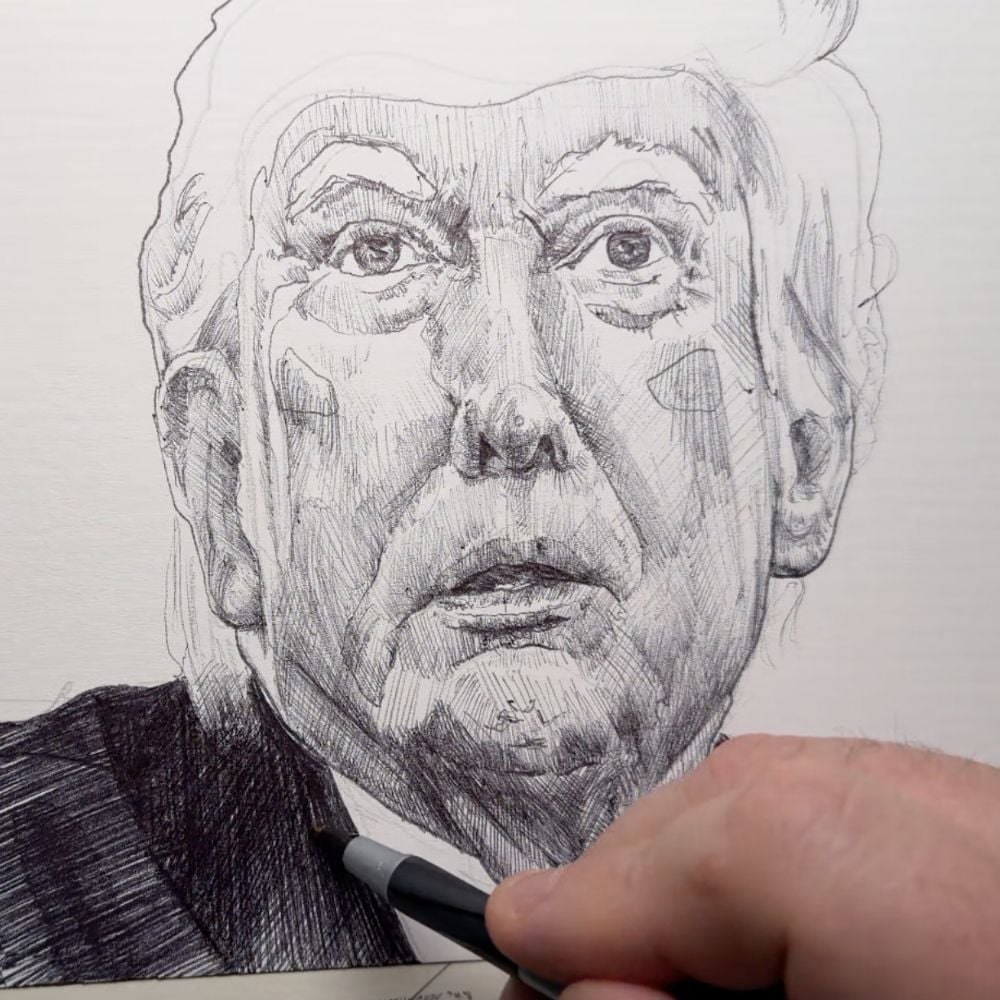 Each mark is intentional, using ink’s permanence to underscore personality and tone. The piece is part of the Political Portraits Collection, a series of expressive hand-drawn works exploring the humanity, ego, and theater of political figures through traditional mediums.