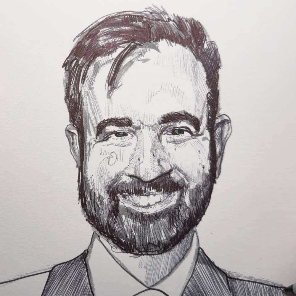 This 6×9 original pen and ink portrait of Zohran Mamdani captures the New York assemblyman’s signature warmth and confidence — a grounded smile rendered through expressive hatching and deliberate brushwork.